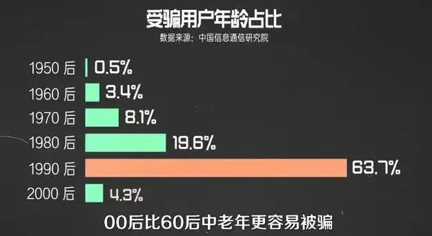 受骗者年龄集中在90后,占比63.7%,其次是80后,19.6%。而00后受骗用户占比,甚至高于50后和60后的中老年人。