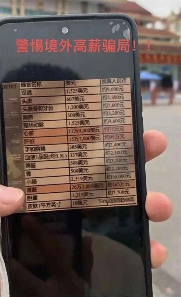 网上盛传有各个器官、各个部位的价目表。