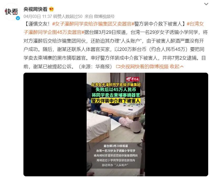 有人灌醉同学后,以45万把她卖给柬埔寨摘器官。